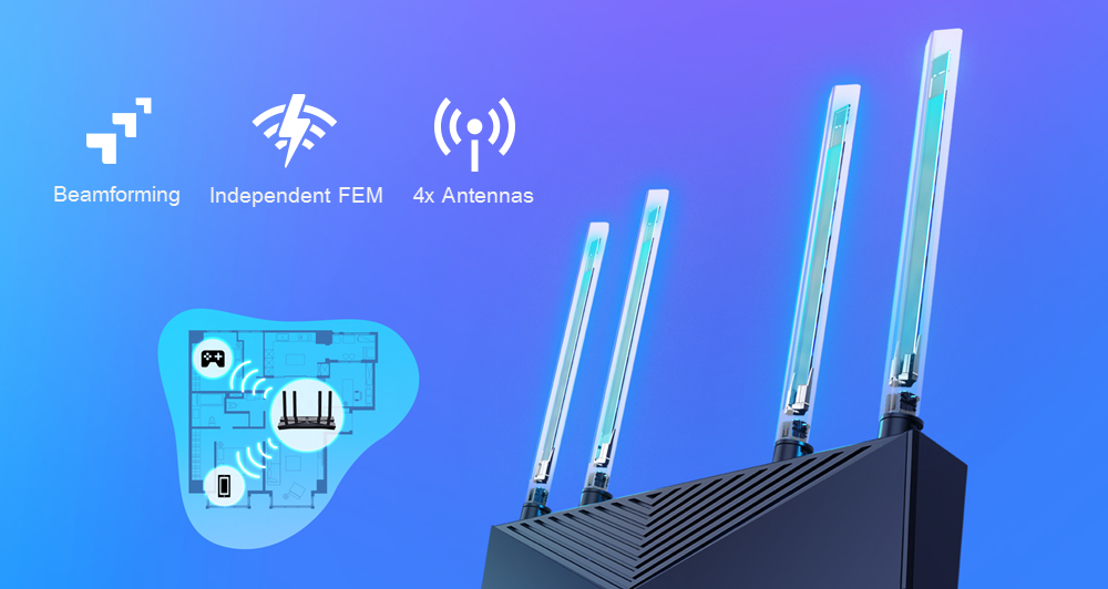 Extensive Wi-Fi Coverage with Advanced Technologiesเทคโนโลยี Beamforming , independent Front-End Module, และเสาสัญญาณ 4 เสาสัญญาณ พร้อมที่จะรวมกับเพื่อปรับแต่งสัญญาณให้สมบูรณ์ เพิ่มความแรงอินเตอร์เน็ตให้ทุกอุปกรณ์ของคุณ |
